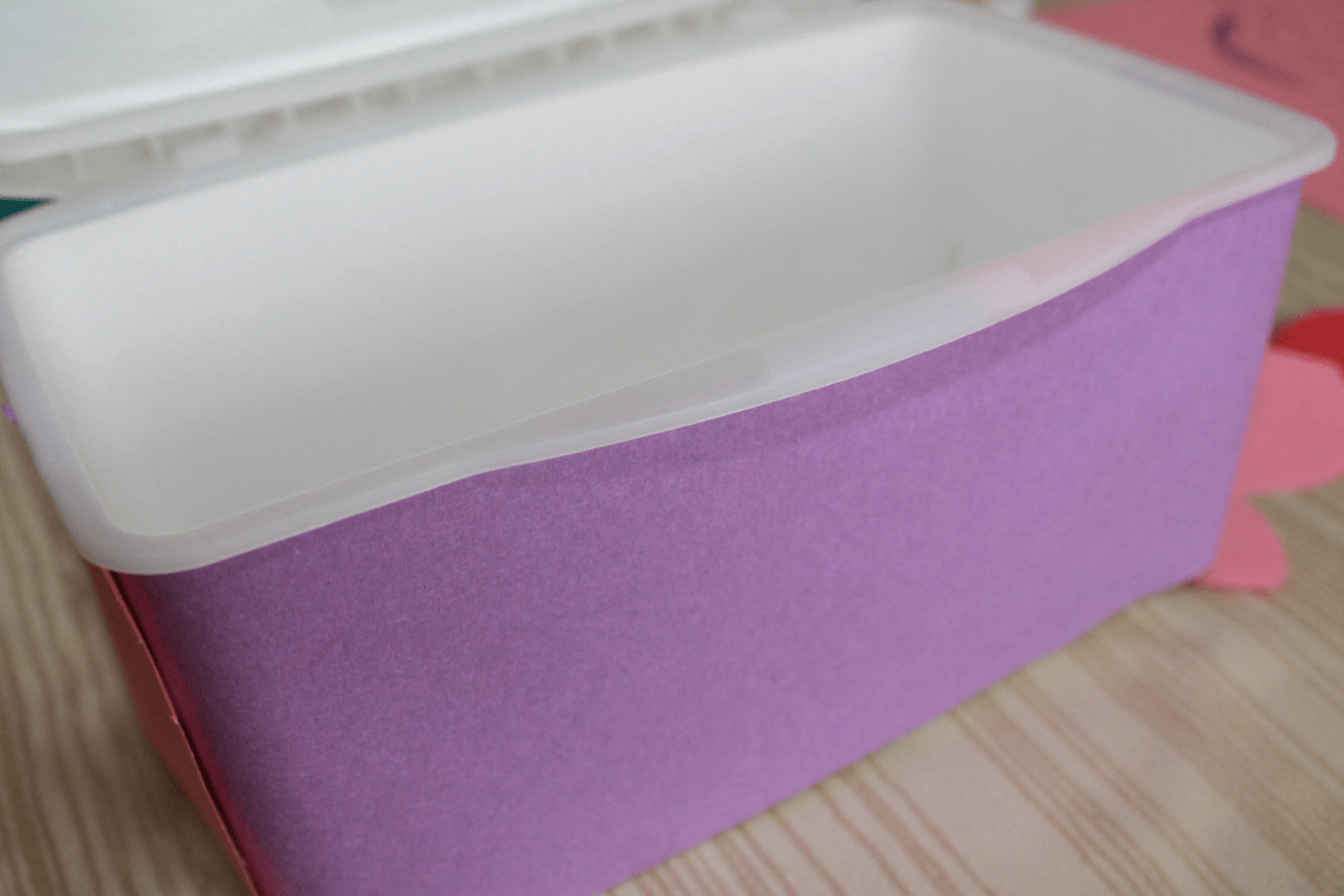 I love to recycle and reuse. So I decided to make Mia a Valentine’s Day box for her cards using a Huggies Wipe Container.