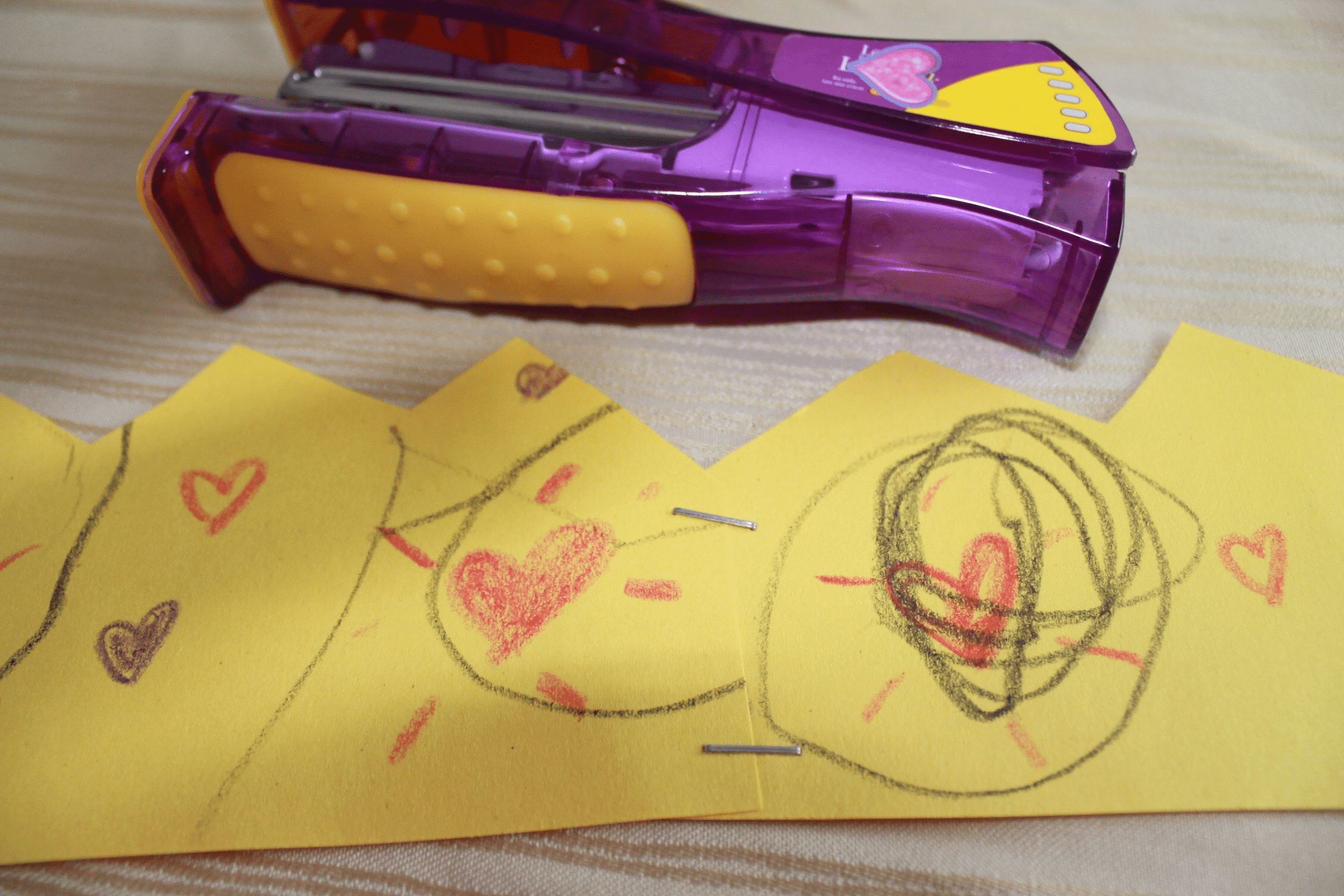 Construction paper, Crayola Crayons, Scissors, Stapler and Valentine’s Day stickers (optional)