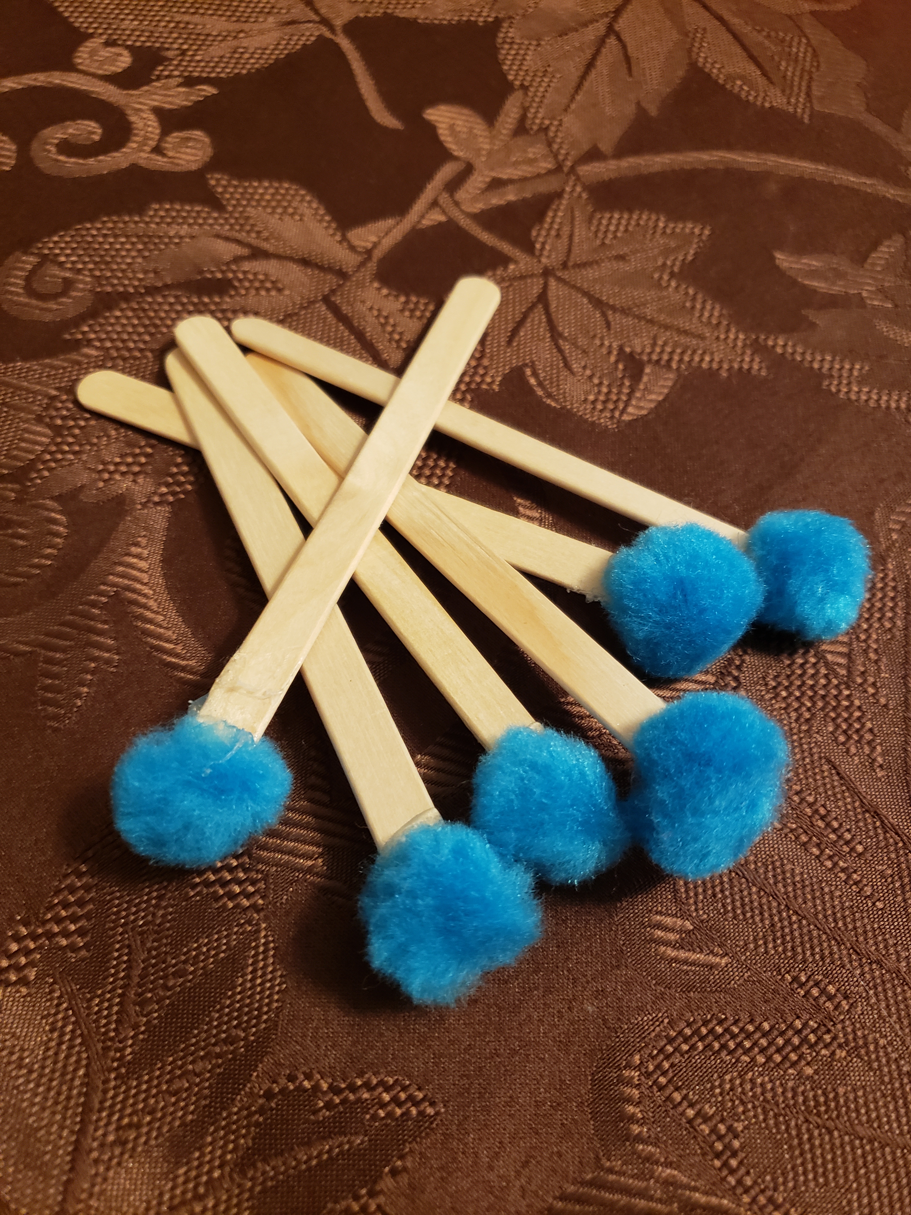 I got 6 medium sized pom poms (all the same color) and I hot glued them to the craft stick. I made 2 sets one with blue and the other purple (seen in the pictures below).